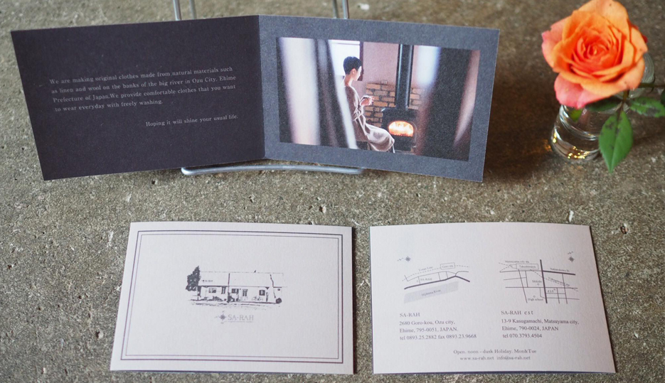 愛媛県大洲市のお洋服ブランドSa-Rahさんのショップカードとインストラクションカードを製作しました。日本語と英語の2パターンで、写真・デザイン・翻訳をさせて頂きました。